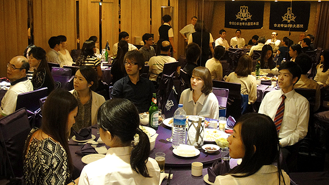 今回は、通常の台湾OBメンバー以外に、母校から国際部の竹中敏治国際教育グループ長ら一行3人と、母校の国際インターンシップで台湾THKへ研俢に来た村田さんと吉田さんも出席、また、夏休みに帰国した在学生と9月から母校へ行く留学生、交換生も招待して合計34名、これまでの新記録の参加者数となりました。