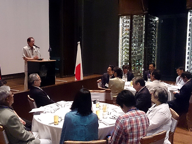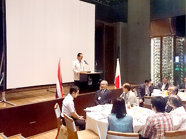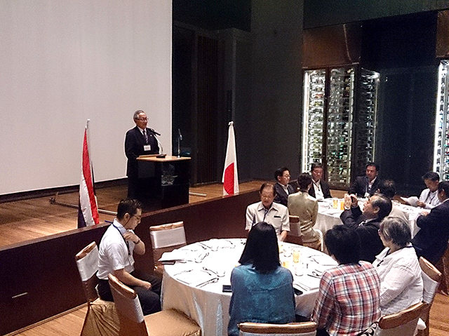 2日目はそれぞれ申し込んだオプショナルツアーを楽しみ、午後18:30から泰国千里会との合同交歓会を開催した。一行27人に加えて、泰国千里会メンバー15名、現地合流の校友3名、オプショナルツアーで見学した会社「エムテック」の研究者2名、そして、大学からの来賓として国際部副部長の田村 裕化学生命工学部教授、計48名が一堂に会した。