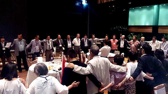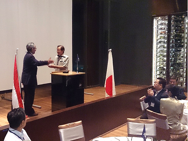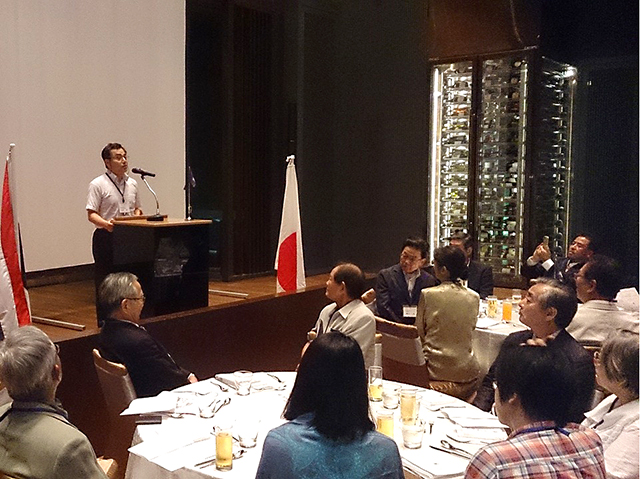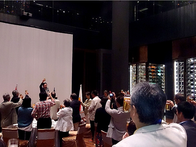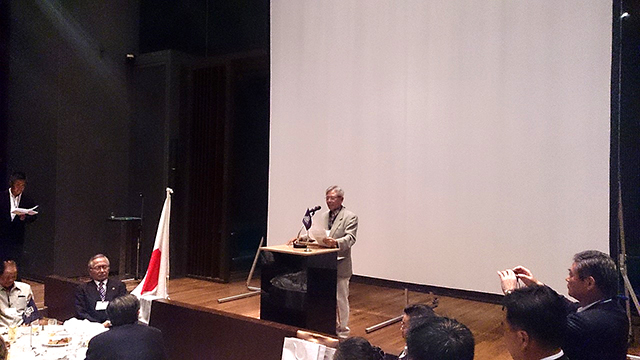 そして、田村 裕先生からは、現在進めている東南アジアを中心とした大学の国際戦略について述べられ、これまでのご支援への御礼とともに、今後のさらなる大学との緊密な連携と協力体制の強化を要請された。続いて、校友会本部からの記念品が寺内会長より中村会長へ贈呈され、燈田進評議員会副議長の乾杯の発声で歓談となった。各テーブルでの交流に華が咲き、途中には、母校の近況を納めたDVDなどを観覧しながら、母校のこと、仕事のこと、各世代それぞれの時代を懐古しつつ、親睦を深めた。宴もたけなわとなり、全員で記念撮影をし、馬渕純一事業副部長のリードにより全員で方を組んで逍遙歌を合唱、最後は、泰国千里会の角田 勇副会長から、国際化へと取り組む母校に対して今後も協力を惜しまないとの力強いお言葉をいただき閉宴となった。