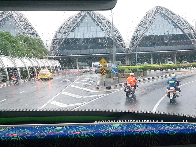 関西空港での結団式を終えて、空路タイ・バンコクへ。現地時間の午後3時30分、スワンナプーム国際空港に到着。空港では歓迎の横断幕で迎えられ、バスに乗り込んでバンコク市内へ。バスの前方には2台の白バイが先導、渋滞をスムーズに運行するというサプライズの演出があった。宿泊先の「ル・メリディアン・バンコク」に到着し、早速夕食は、タイの異国情緒溢れる雰囲気のレストランでタイ料理を満喫した。