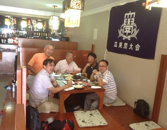 第4回広東関大会は佛山市順徳区にて開催された。順徳は広州市の南西約40kmに位置する緑深く、芳醇な食材が溢れる美しい街である。順徳料理は広東料理の一つとして有名であり、周富徳さんの祖先もここの出身だそうである。また、ブルース リー(李小龍)の祖籍(元籍地)も順徳区均安鎮で、そこにはブルース リー故居や記念館もある。そのような歴史に薫る地で働いておられる櫻田さんのご指名店である日本料理「江戸屋」が今回の会場に選抜された。長谷川さんは香港からフェリーで2時間、是澤さん、前さん、東口は広州市内から陸路を1時間駆けて集合した。
