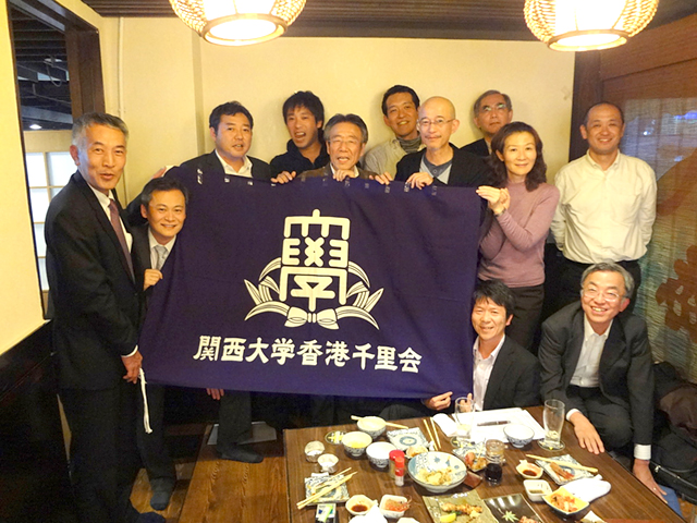 今回、校友会から贈っていただいた重みある紫紺の「関西大学香港千里会旗」を掲揚すると、香港千里会に箔がつき同窓生の士気が一気に高まりました。