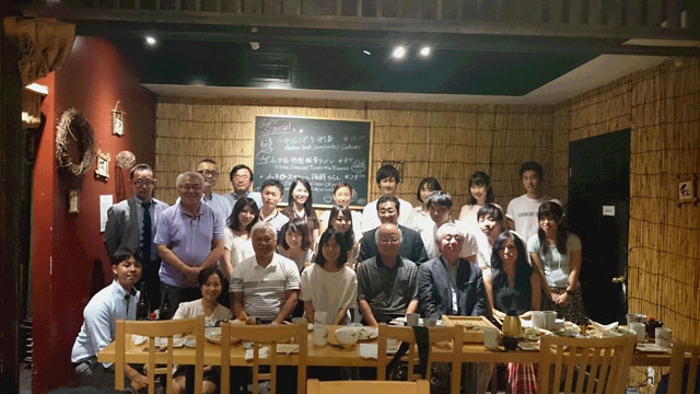 学生たちは、先輩との交流を楽しみながら、先輩の仕事ぶりや生活、人生観に熱心に耳を傾け、熱心に質問をしていた。時を忘れるとはまさにこのことを言うのか。限られた時間はあっという間に過ぎ学生たちは宿舎へ戻った。その後、OB数人らと二次会としてホテルのバーへ移動。話は尽きず、お酒を味わいながら彼らにとっては懐かしい母校への思いに華を咲かせ、母校に校友会に期待を込めて大激励をいただいた。時計の針は真夜中を過ぎ、名残惜しくもここで解散。皆で学歌を口ずさみ帰路へついた。