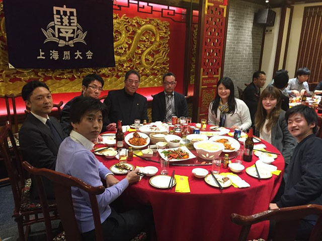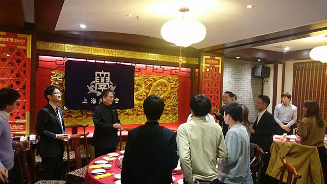 11月10日、上海に到着した一行は、同日夕刻からの上海関大会例会に出席。その前に、同会の山本震一幹事とお会いし、大学と校友会との在り方や大学の国際化と現地校友会との連携について話し合った。