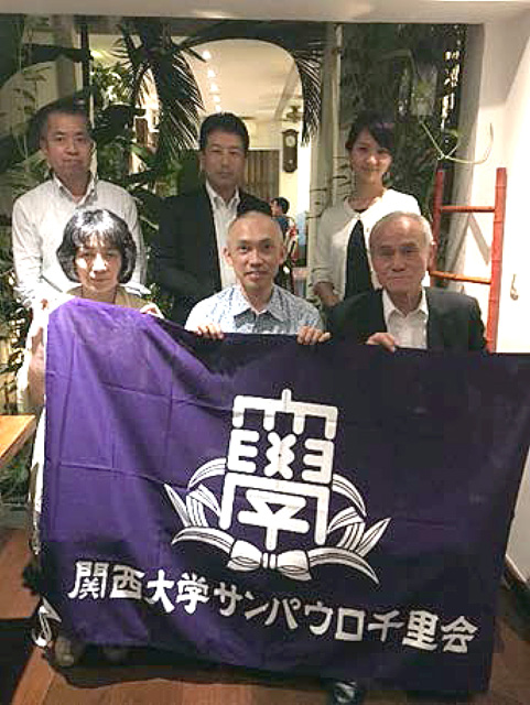 今回は、商学部準教授の長谷川先生ご夫妻の来伯に合わせて、3月6日にお馴染みの「梵」で懇親会を開催した。鈴木会長の出席は叶いませんでしたが、大上進(47学法)、桟潔(58学経)、川部弘明(平4学法)、田那邊(旧姓山田)奈央(平20学経)の4人が集い、長谷川先生夫妻を囲み、初めて支部旗(サンパウロ千里会旗)を掲げての開催となった。