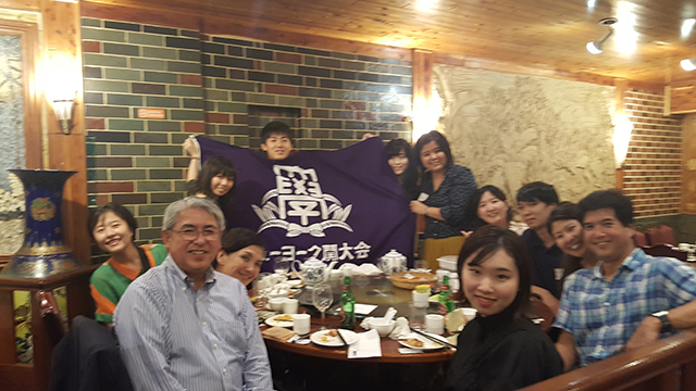 国際インターンシップ参加学生との交流会を、マンハッタン中華街にあるCongee Villageで開催した。参加した校友は、企業経営者、会社員、エンタメ系に医療系、大学院生、家庭で奮闘中の主婦などさまざま。学生からの質問や不安にもいろいろな角度からアドバイスでき、この豊かなバリエーションが関大の魅力であり、強みだとあらためて感じた。