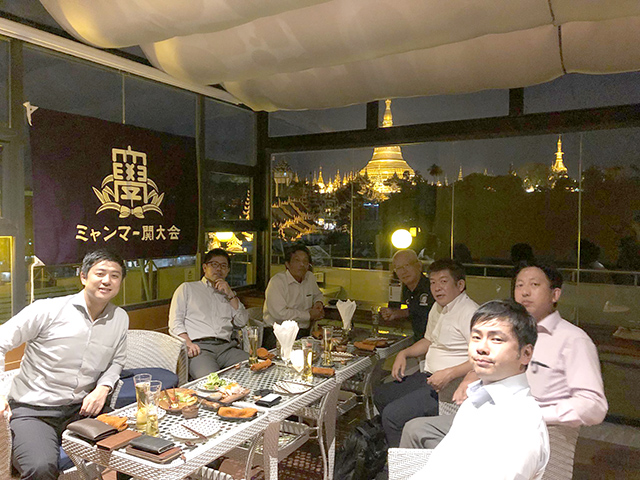 今回は、世界遺産のシュエダゴンパゴダを一番近くで見られるワインバー「月とワイン」で関大会を開催しました。広報担当の原口氏の送別会も兼ねて行った今回の会は、ミャンマー関大会が発足してから3年目を祝う会にもなりました。今回初参加の方もいらっしゃいましたが、関大の卒業生という共通点だけですぐさま意気投合し、色々な話を肴にどんどん酒が進みます。最後は世界遺産と校旗をバックに皆さんで記念撮影をして締めくくりました。次回は事務局の奥田氏を迎えて関大会を開催します。