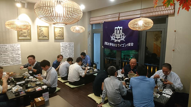 当日は月曜日ということもあり会員も慌ただしく、小島秀会長をはじめ、参加者はわずか3人。しかし、ベトナムでのビジネスや文化・生活環境についてなど、それぞれが熱心に語っていただいた。最初こそやや緊張感があったものの、お酒も入って、次第に緊張も解れて会話が弾む。ほとんどが関西大学卒業ではないメンバーだったが、最後はまるで同窓生かのように胸襟をひらき、笑い声の絶えない大変楽しく充実した交流会となった。