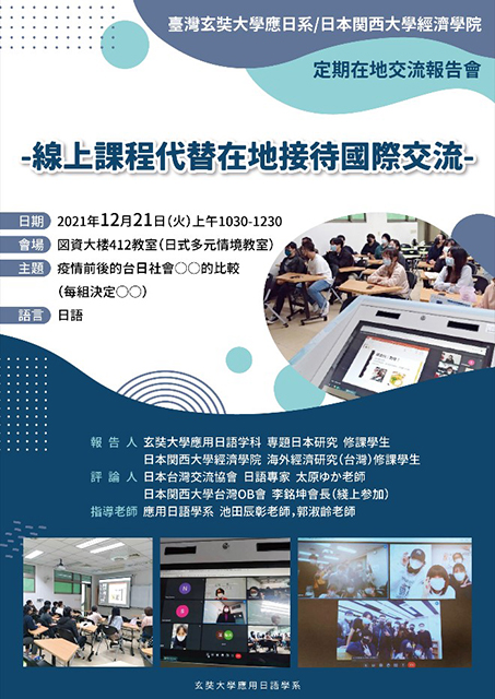 日本人OBの一人、池澤君は大学院修了後、台湾の亜州大学博士課程に留学中で、台湾OB会には初参加であった。経済学部では2013年12月以来、2015・2017・2019年と二年に一度、12月に台湾を訪問するプロジェクトを実施している。訪問時には台湾OB会が歓迎会を開き、OBと関大生の交流を深めるのだが、Covid-19の影響で2021年12月の訪問は実現しなかった。しかし、台湾OB会の池田副会長が学科長を務めている玄奘大学が受け入れ先となりオンラインでの交流授業を実施、12月21日には日台の学生オンライン交流成果報告会が開催された。当日はオンライン上で学生だけではなく、北原経済学部長や台湾OB会李会長もコメンテーターとして参加され、関大学生と台湾の若者との交流促進の一翼を担うこととなった。