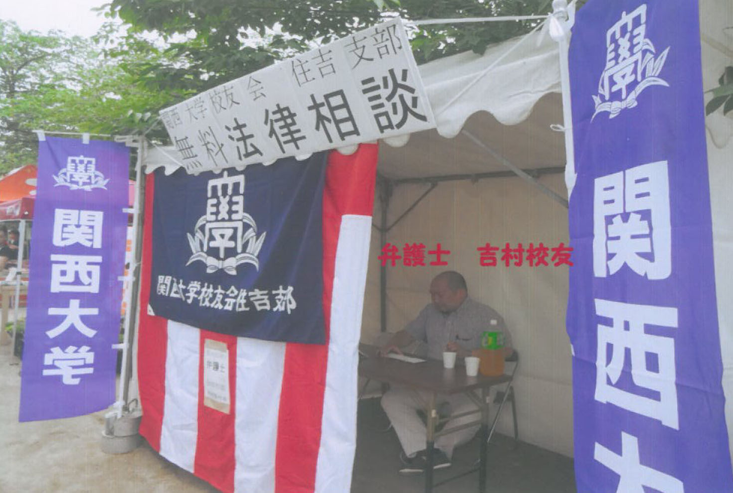 大阪市住吉区帝塚山万代池で毎年5月の最終土・日曜日、帝塚山音楽祭が催されます。今年も住吉支部(小林洋司支部長)は参加しました。音楽祭とはいえ、池の周囲に様々なブースが設けられ、手作りショップ・リサイクルショップ・お肌のチェックコーナー・フードショップ等々ある中、我われは、ほかには真似できぬ関西大学出身の弁護士吉村校友と豊川校友を携えて無料法律相談所を開設しました。
