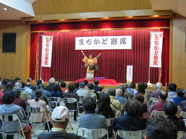 初めにリスナップ2人の漫才では軽妙な関西弁で会場の笑いを誘い、爪田家らいむさんは新作落語「猫と金魚」を、また沖縄出身の花の家くれあさんが沖縄衣装で三線を弾きながら「沖縄歌謡ショー」を熱演。トリを務めた月亭八方さんの弟子、月亭方気さんは古典落語「ふぐ鍋」を披露。まくらで「尾道で落語をするのが子供の時からの夢でした」と切り出し会場を沸かせた。