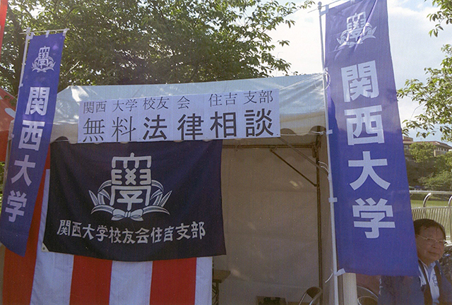 住吉支部(小林洋司支部長)が無料法律相談所のブースを構えること今年で3年目。すっかりお馴染みになったのか、関大の幟目当てにクライアントが続々。予約用紙に行列ができる立派な法律相談所。初日は18人・2日目は21人。但し無料。しかも守秘厳守で弁護士吉村・後藤・横枕校友以外何もわからないと言う不思議な催し。