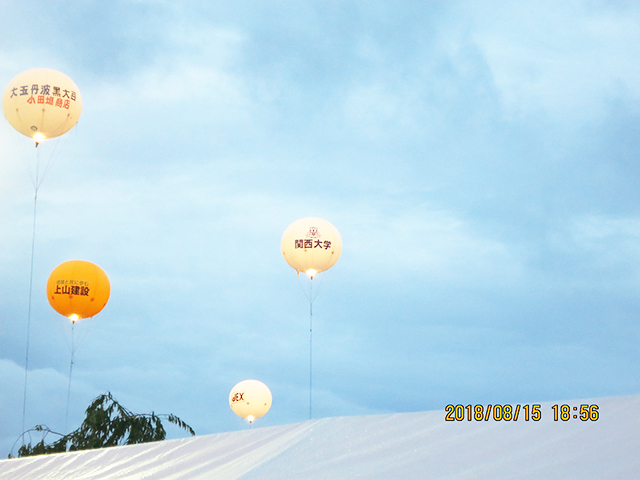 高額のアドバルーンを城跡間横に上げ、夜空に母校「関西大学」のアドバルーンがくっきりと輝き、昼間から陣取っていた関大エリアで見上げると、まるで関大キャンパスで打ち上げられているかの如く1000発の花火の饗宴に酔いしれた。