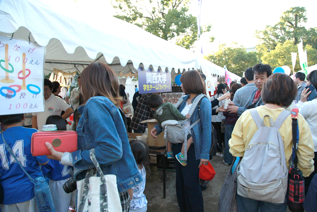 開店時間前から、続々子供たちがやってきて、その後行列が途絶えることがなく、応援団の学生たち、若手、壮年、老年幹事たち総出で行列整理、子供たちへの対応に大わらわだった。もちろん関大の宣伝も忘れず!