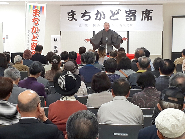 今回も、大阪から落語大学出身の落語家ら4組5人が出演、緊張をほぐしながらいつもの軽快なテンポで会場の笑いを誘いました。