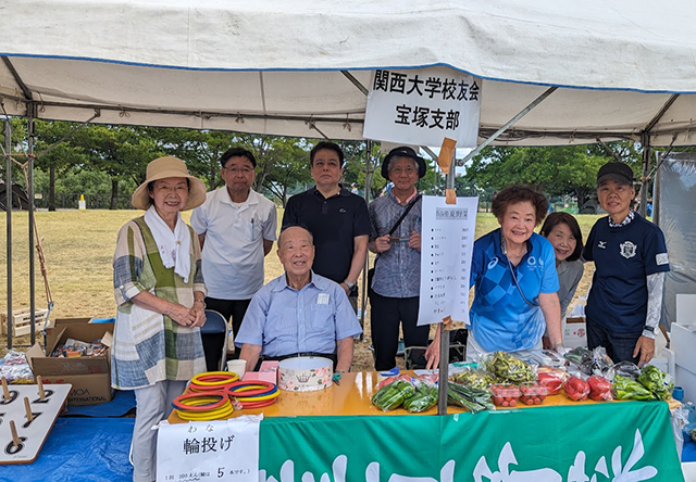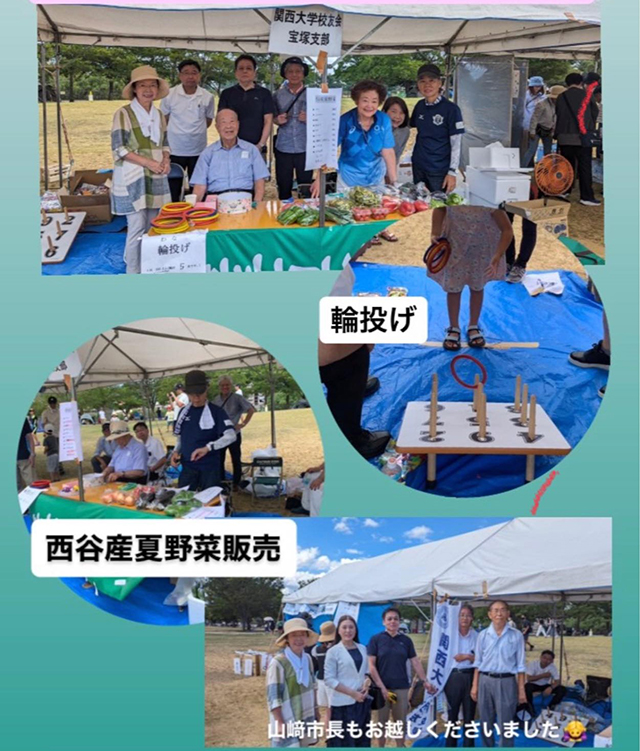 前回には老若男女多くの方にお越しいただきました。コロナ禍で4年振りとなった今回も関西大学の絶好のPRにもなると考え、輪投げと宝塚産の野菜販売をしました。会場は、大勢で賑わい、活気のある一日でした。炎天下11時からのスタートで、16時まで約250人の子どもたちが輪投げに参加してくれました。お野菜も14時ごろまでにほぼ完売。猛暑で大変でしたが、「卒業生です」と名乗ってくださる方もいて、嬉しい出会い場でもありました。これからもこの繋がりを大切にしたいと思っています。
