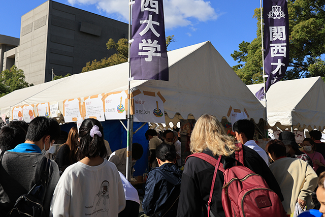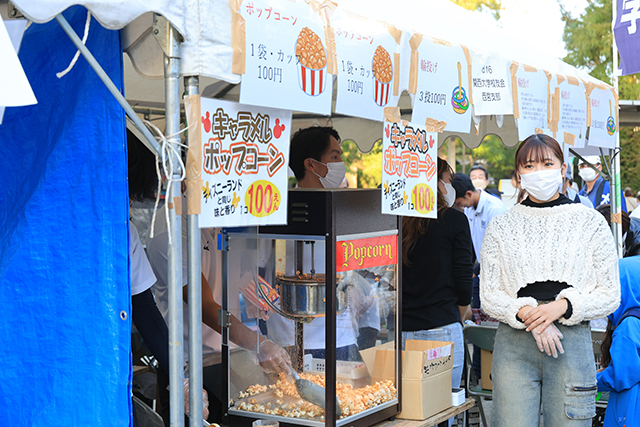 なかには、関大校友会ののぼりを見て、初等部在学のお子さまとともに来店された方や、お孫さん全員分のポップコーンをお買い求めになる大先輩も登場。支部テントの周りには、キャラメルポップコーンの甘い香りと関大愛があふれていました。