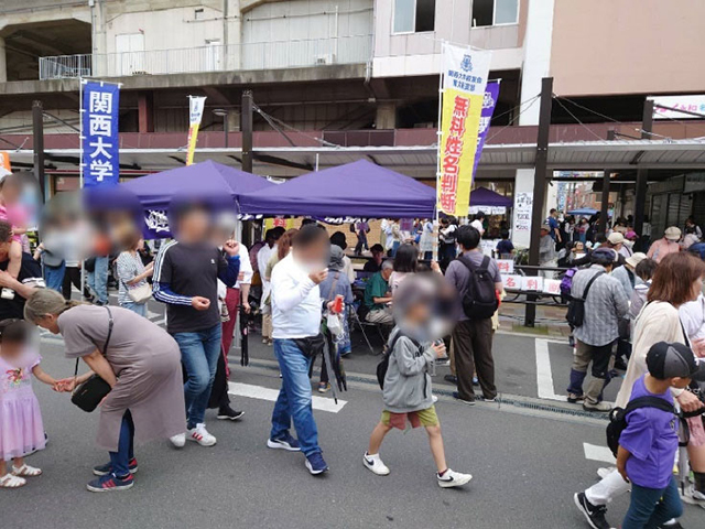 当⽀部では近鉄永和駅前で毎年2区画にテントを設置し14人の校友の運営のもと3台のパソコンとプリンターを⽤い「パソコンによる姓名判断」を出展しました。