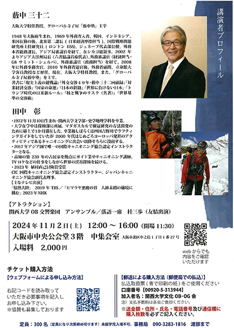 当日は、探検部OB田中彰氏(キャニオニングのカリスマ)「渓谷探検に賭ける人生」、薮中三十二大阪大学特任教授(グローバル寺子屋「薮中塾」主宰)「緊迫する国際情勢と日本」のご講演、桂三歩師匠の落語、OB交響楽団アンサンブルの演奏で幅広い分野のプログラムでした。