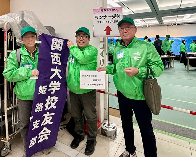 姫路支部「姫路城マラソン2025」に ランナー受付ボランティアとして参加 2025.02.23 2月23日に開催された姫路城マラソン2025におきまして、前日の22日にランナー受付ボランティアを関西大学校友会姫路支部というグループ名で参加させていただきました。 3名だけの参加でしたが、ランナーの方々に激励できたものと思います。 地域の自治会や勤務先会社でのボランティア参加されている校友会メンバーも多く、地域で活躍されています。 今後とも取り組んでいきたいと考えています。 姫路支部長 白井義一